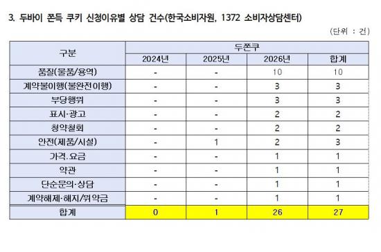 Çѱ¹¼ÒºñÀÚ¿ø 1372 ¼ÒºñÀÚ»ó´ã¼¾ÅÍ Á¢¼ö ÇöȲÀ» º¸¸é 2024³â 0°Ç, 2025³â 1°Ç¿¡ ºÒ°úÇßÀ¸³ª, 2026³â 1¿ù 25°Ç, 2¿ù 1°Ç µî µÎ ´Þ°£ 26°ÇÀÌ Á¢¼öµÆ´Ù. 2024³âºÎÅÍ 2026³â 2¿ù±îÁö ´©Àû 27°Ç °¡¿îµ¥ 26°Ç(¾à 96%)ÀÌ 2026³â¿¡ ÁýÁßµÅ, ¿ÃÇØ µé¾î ¼ÒºñÀÚ ºÒ¸¸ÀÌ º»°ÝÀûÀ¸·Î Ç¥¸éÈ­µÈ °ÍÀ¸·Î ºÐ¼®µÈ´Ù.